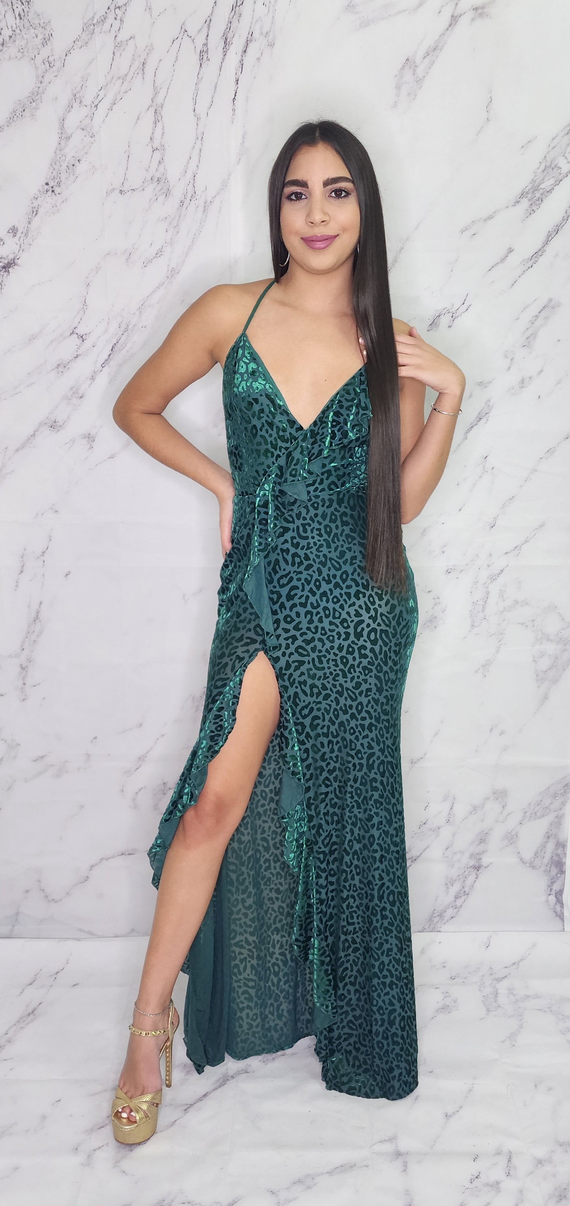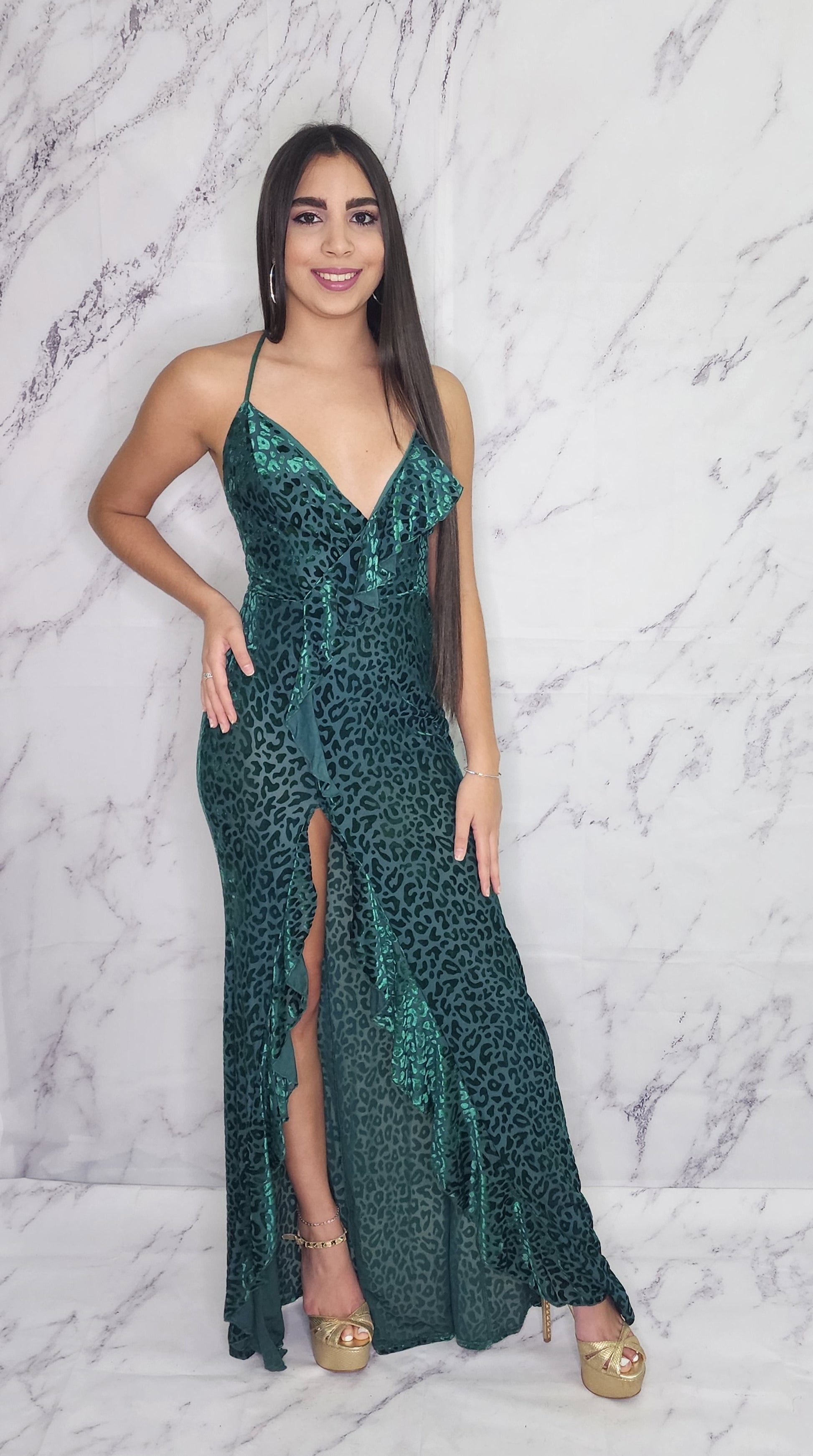 Vestido verde, es un poco transparente, pero casi no se nota.